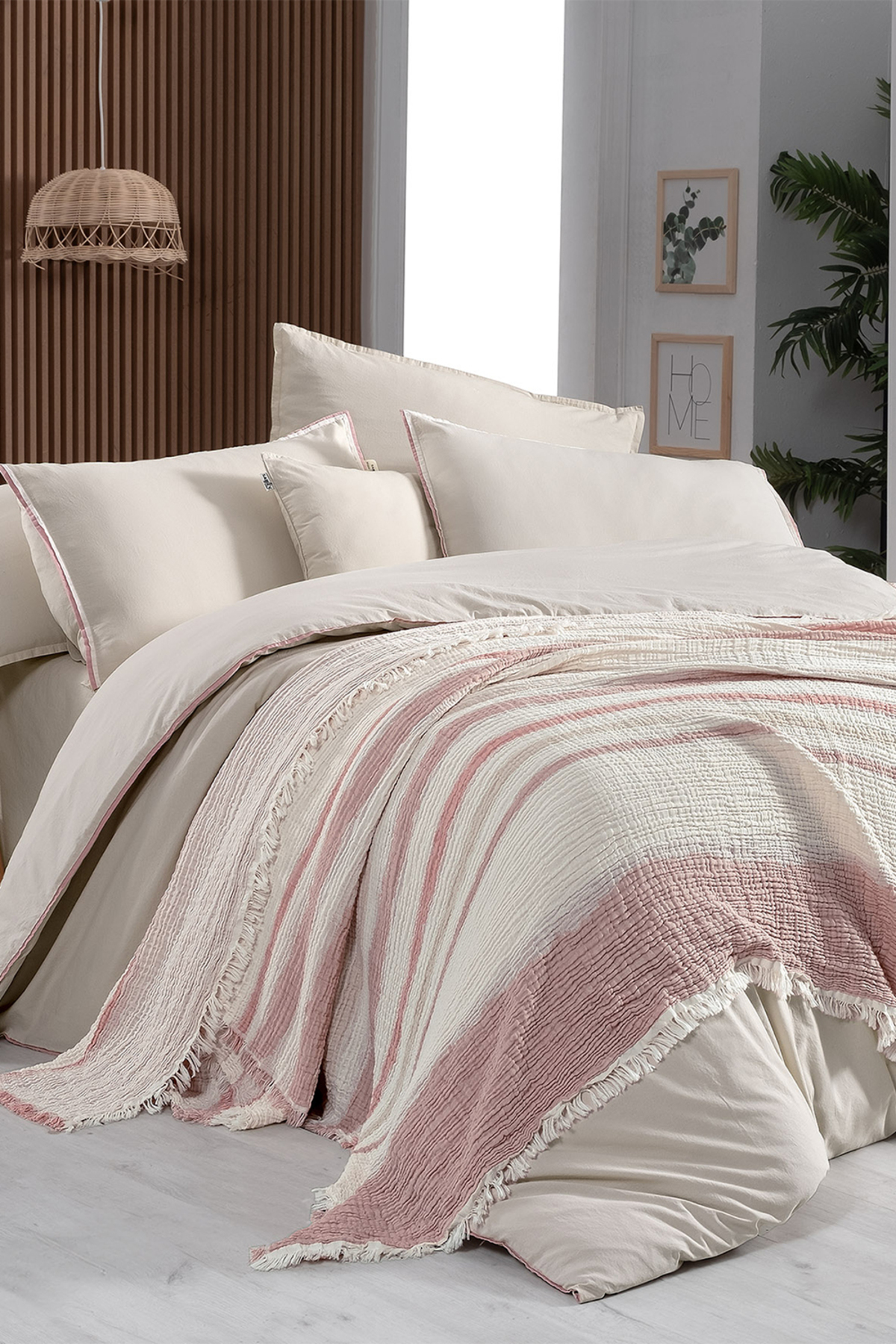 Çift taraflı tasarımı ile dekorasyonunuzu kolayca yenileyebilir, her iki yüzeyi de farklı bir atmosfer yaratmak için kullanabilirsiniz; - Çizgili deseniyle modern ve şık bir görünüm kazandırarak yatak odanızın dekorasyonuna estetik bir katkı sağlar; - Yıkama talimatlarına uygun şekilde kolayca temizlenebilir; çamaşır makinesinde 40 derecede yıkanabilir, kurutma makinesinde kurutulabilir ve ılık ütü ile ütülenebilir; - Kutulu ambalajı sayesinde ürününüzü hemen kullanmaya başlayabilir ve ekstra bir paketleme gerektirmeden rahatlıkla saklayabilirsiniz;