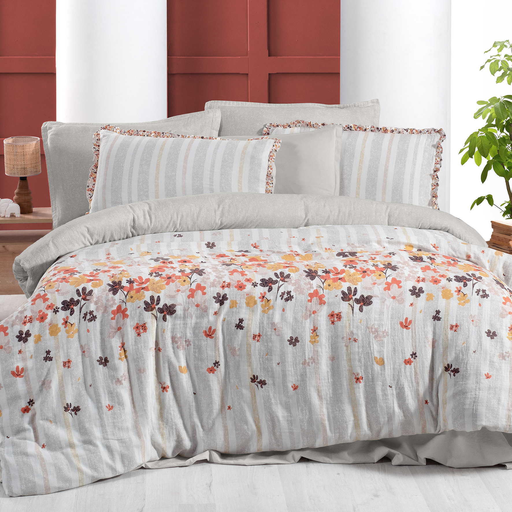 Kumaş Kalitesi;%100 Pamuk, müslin, yıkamalı nevresim takımı. Yastık kenarlarında oxford dikiş ve şerit biye. Nevresim kapak kısmında şerit biye. Baskılı ürün.